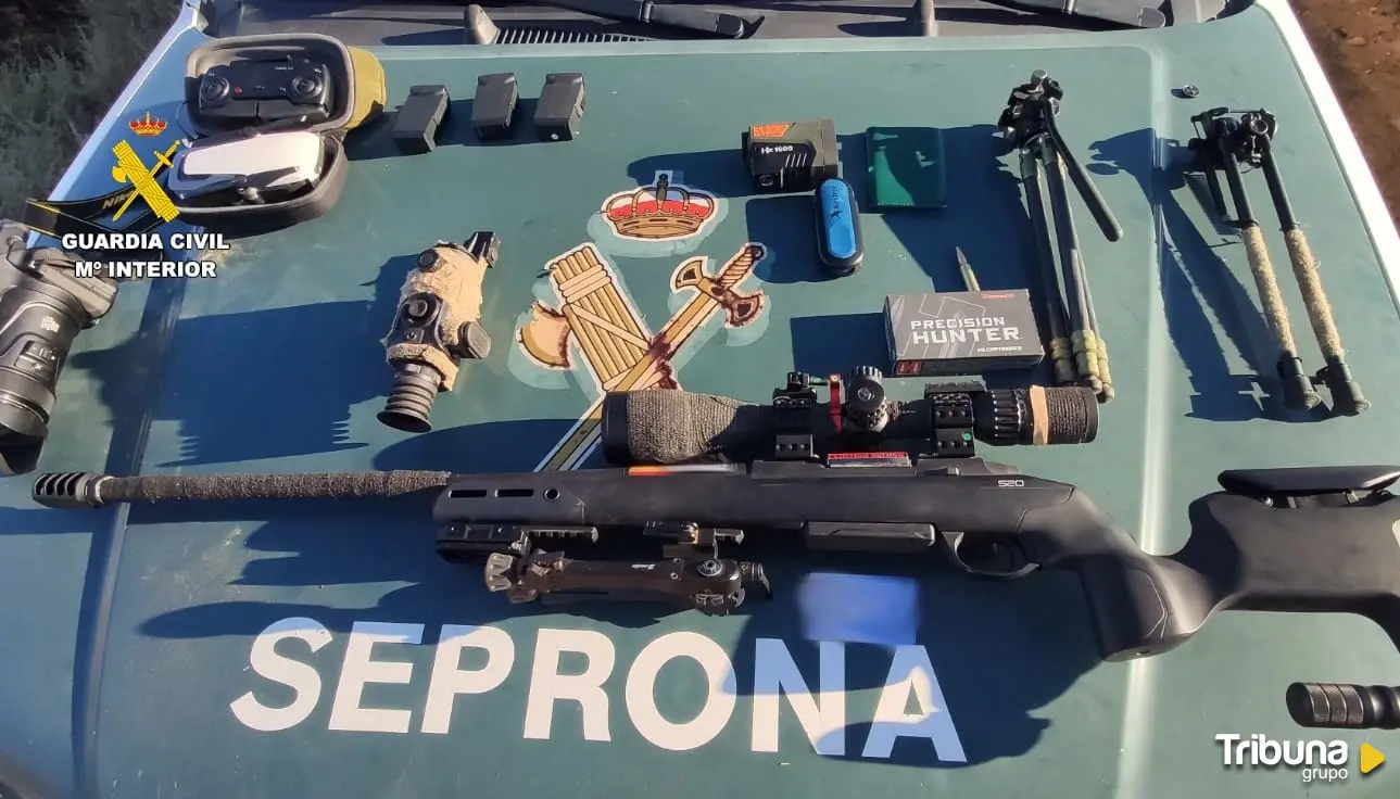 Los agentes intervienen un rifle de caza, cartuchería, visor térmico, telémetro, cámara de fotos y un dron, entre otros utensilios