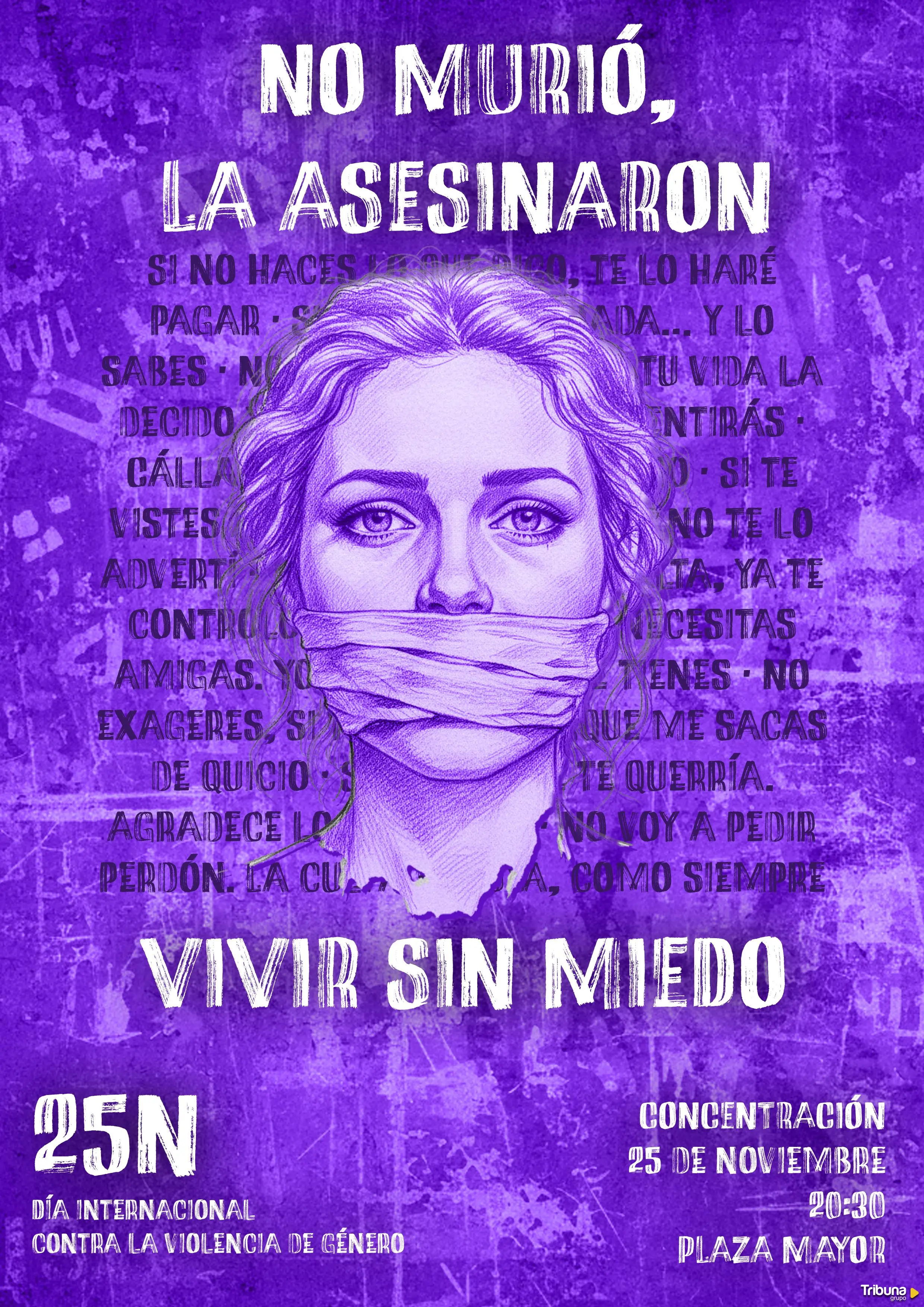 'No murió, la asesinaron. Vivir sin miedo'. Zamora se ha sumado con ese lema a la concentración en repulsa por la violencia machista convocada para este martes 25 de noviembre por la Coordinadora Feminista de Zamora en la Plaza Mayor de la capital zamorana. En el cartel, y sobre un fondo de color violeta, la imagen de una mujer amordazada, mirando al frente, sobre palabras pronunciadas por agresores.