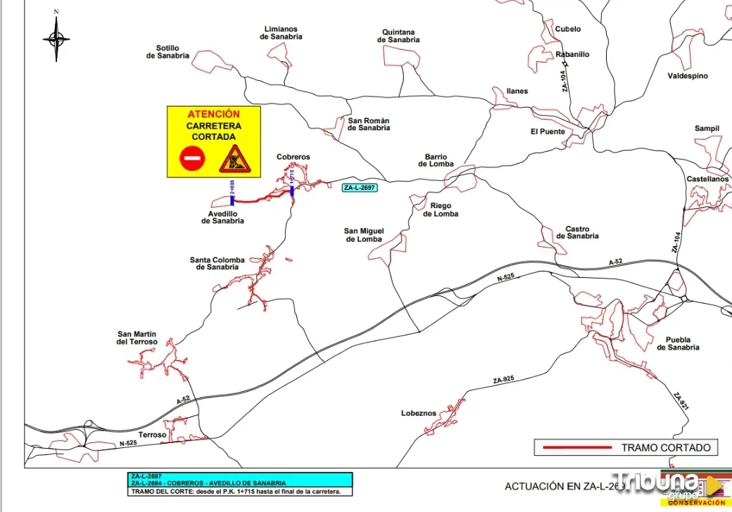 El corte previsto inicialmente para el pasado 21 de noviembre en la carretera ZA-L-2697 (ZA-L-2694 – Cobreros – Avedillo de Sanabria), entre el punto kilométrico 1+715 (cruce con la ZA-L-2695) y el final de la vía que quedó pospuesto por causas meteorológicas, se llevará a cabo esta semana.