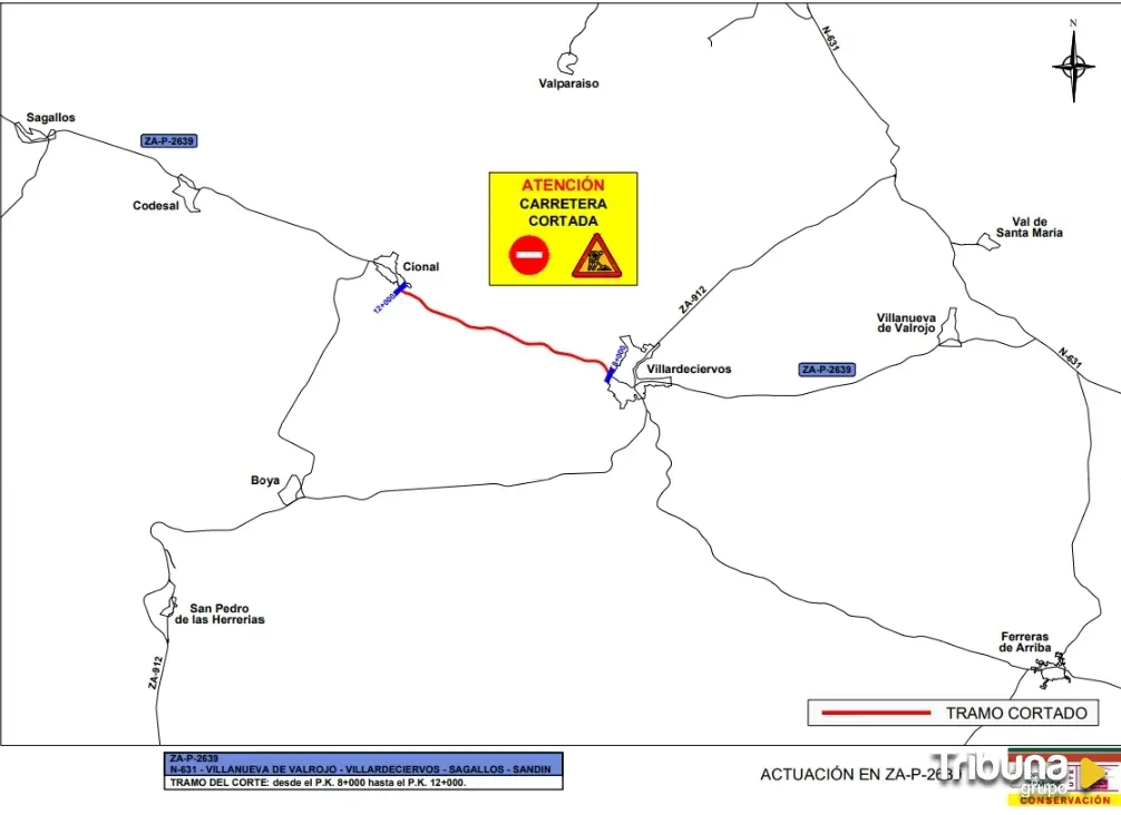 Desde la Diputación de Zamora se ha informado de que, para tal fin, será necesario llevar a cabo el corte temporal de esta vía provincial (N-631 – Villanueva de Valrojo – Villardeciervos – Sagallos – Sandín), entre los puntos kilométricos 8+000 y 12+000.