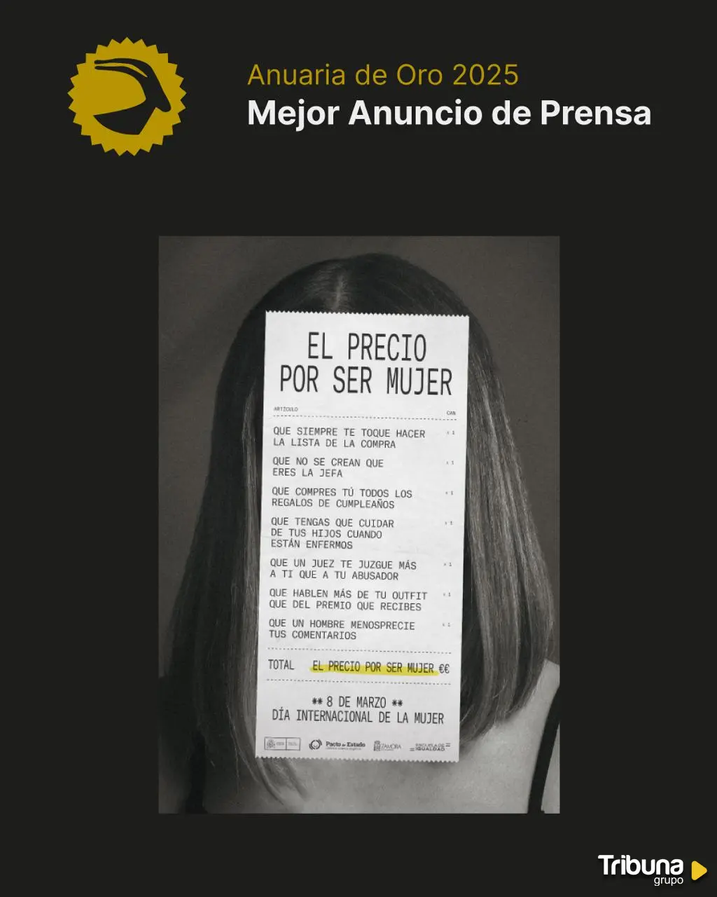 La campaña 'El precio de ser mujer' puesta en marcha por la Concejalía de Igualdad del Ayuntamiento de Zamora, llevada a cabo por la agencia Alto el fuego, ha obtenido el galardón Oro en los Premios Anuaria 2025 en la categoría 'Anuncio de prensa'.